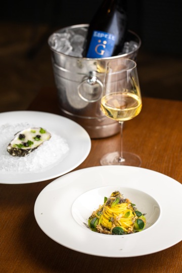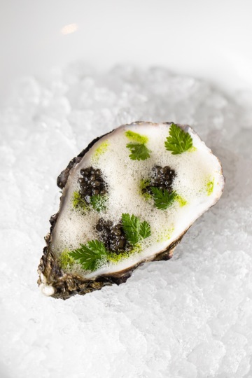 Ústřice Gillardeau, mignonette pěna, kaviár Da Vinci, pažitkový olej