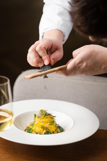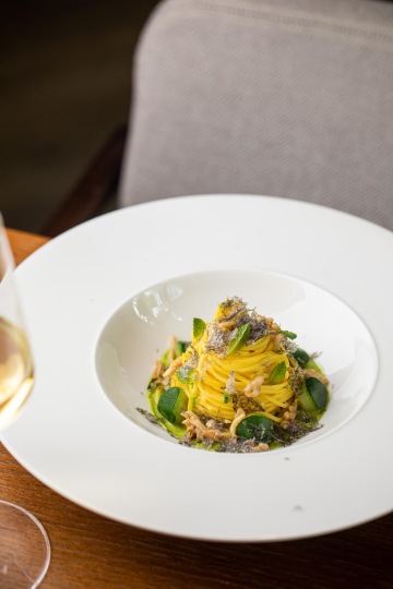 Tagliolini, trippa di baccalà, cuketový krém, máta, sušený kaviár Lingot