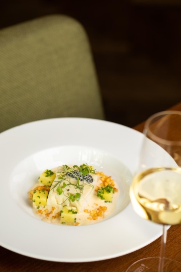 Hřbet z tresky, celerová espuma, smažené brambory, omáčka beurre blanc, kaviár Oscietra
