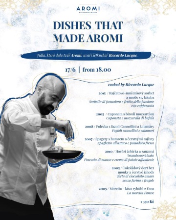 Riccardo Lucque se vrátí do kuchyně. Uvaří ikonické chody posledních let, ty nejlepší speciality, které daly tvář a slávu Aromi. Vychutnejte si pravou italskou pohostinnost a skvělé degustační menu.