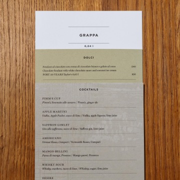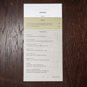 The new menu uses an elegant and timeless design, incorporating colors from the restaurant. The natural green of the dessert menu and the soft grey tone of the cocktail card are mirrored in the interior.