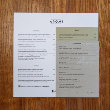 "While creating the new menu, I was inspired by the color and the element of horizontal lines in the restaurant logo, the new interior, and the character of the brand. I used these in the new a la carte menu for Aromi. The whole menu features high-quality graphic design, and utilizes the font from the Aromi corporate identity"