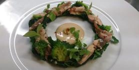 Přijďte ochutnat našeho Salát z králíka se špenátem, brokolicí a lískovými oříšky nebo Pečenou tresku se zeleným chřestem a mušlemi.