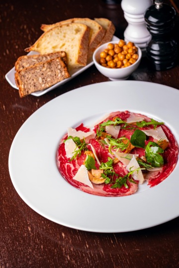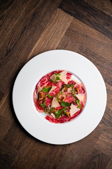 V nadbídce předkrmů zůstalo i oblíbené carpaccio z vysoké roštěné “US PRIME” , jen jsme pozměnili přílohu. Na podzim je to soté ze sezónních hub a stařený parmezán.