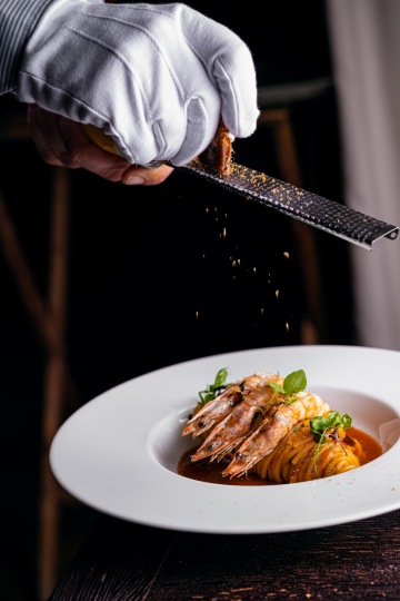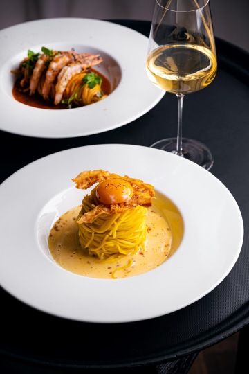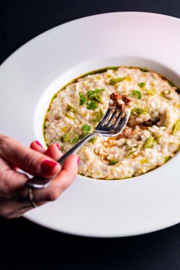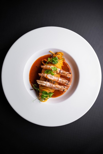 A pojďme na delikátní pastu, spaghetti "Benedetto Cavalieri" se silnou omáčkou s krevetami Mazzancolle a bottargou. Na podzim se hodí divočina, šéfkuchař Petr proto připravil risotto s toskánským ragú z divočáka a nakládanými smrkovými výhonky.