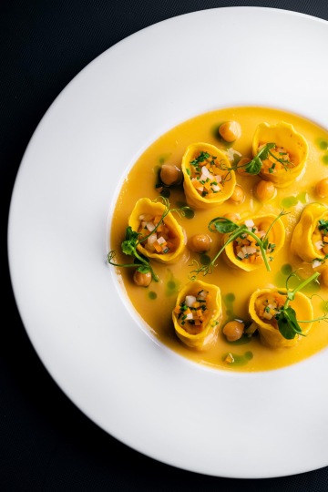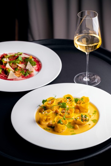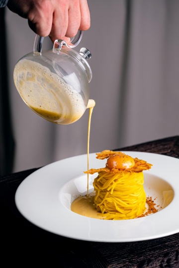 Další novinkou jsou ravioli plněné salsicciou di Bra a cizrnové pyré s citronem. A co nás hodně baví je naše verze tagliolini alla carbonara. Italskou klasiku jsme vám chtěli naservírovat trochu jinak, a tak jsme ji rozdělili na jednotlivé komponenty.