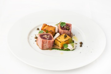 Mezi hlavními chody musíme vyzdvihnout grilovanou chobotnici s karotkovým pyré, romanescem a marinovanou červenou cibulí. Barevně jídlo připomíná hotové umělecké dílo. Rybí novinkou je zprudska opečený tuňák s grilovanými olihněmi, omáčkou z petrželky a bramborami Anna. Pokud dáváte přednost drůbeži, doporučujeme naši variaci mladého kuřete s artyčoky, mladou řepou a fava fazolkami.